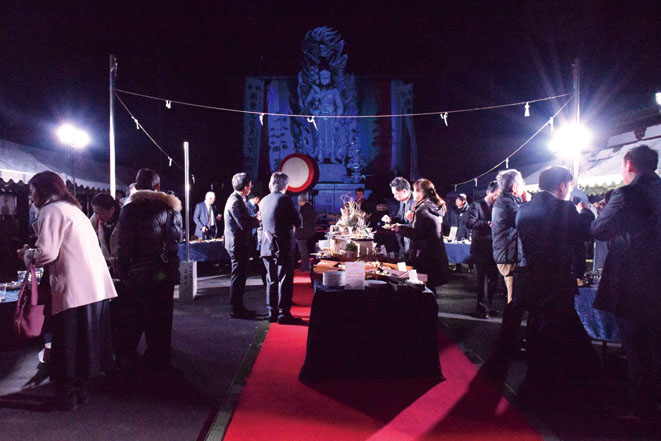 今後のMICE誘致をにらみ、歴史的建造物や文化施設などで会議やレセプションを開催する「ユニークベニュー」の可能性を探るための実証実験として行われたもの。地域特性をいかした同市の犬鳴山七宝瀧寺・不動明王像前広場を会場に、幻想的な雰囲気のなか、立食形式で催された。